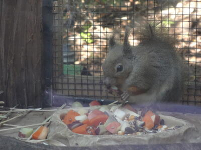 ごはんを食べたり、元気いっぱい動いていました。同行していただいた、いきものふれあいの里センタ―の方に、りすの歯の数は、2本あることや、歯はそのままにしておくと伸びてしまうから硬いものも食べることも教えてもらいました。また、足の指の数は、前足が4本、後ろ足が5本あることなども、本物のりすを見ながら、分かりやすく教えていただきました。
